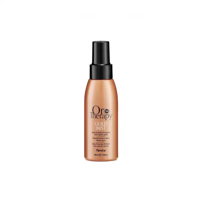 Suite à votre shampoing et masque illuminant Gold d’Oro Therapy, vaporisez sur vos cheveux secs la brume protectrice parfumée.